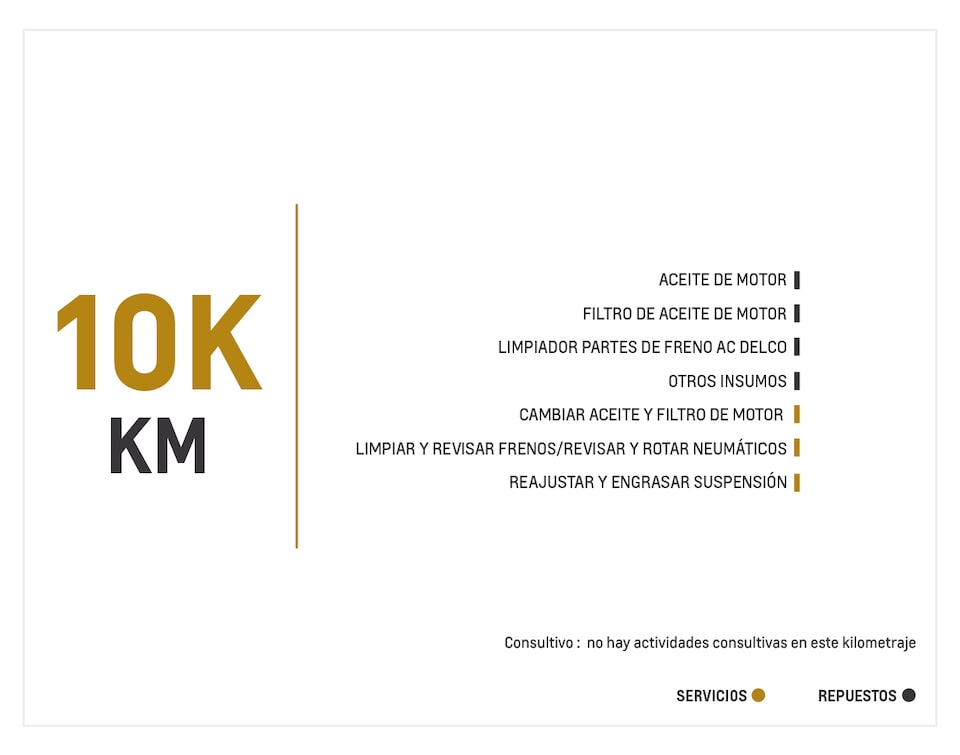 *Las rutinas de mantenimiento expuestas hacen parte de los procesos mandatorios establecidos por la marca. Existen otros procedimientos de rutina de mantenimiento adicionales denominados consultivos, que pueden llegar a prestarse en la red de concesionarios Chevrolet autorizados a nivel nacional.